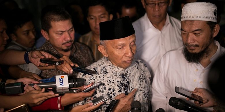 Ketua Majelis Kehormatan Partai Amanat Nasional (PAN) Amien Rais memberikan keterangan pers sebelum menyambangi pansus hak angket KPK di gedung DPR, Kompleks Parlemen, Senayan, Jakarta, Rabu (19/7/2017). Kedatangan Amien Rais guna mendukung langkah Panitia Khusus Hak Angket Komisi Pemberantasan Korupsi (KPK).(KOMPAS.com/GARRY ANDREW LOTULUNG)