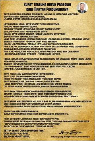 Berikut surat terbuka Herry Tjahjono, seorang mantan pendukung Prabowo Subiyanto pada Pilpres 2014 lalu.