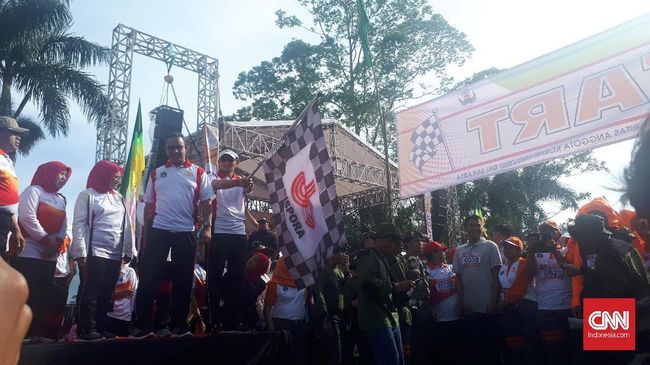 "Buah naga buah kedondong. Ayo, olahraga dong!" ujar Sandi disambut riuh rendah hadirin.