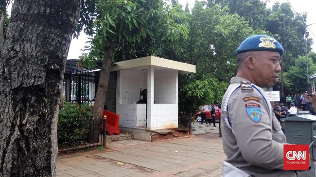 Polisi menjaga dari jarak cukup jauh dari pos lokasi ditemukannya dua tas mencurigakan di pos depan pintu masuk pejalan kaki Gedung Polda Metro Jaya yang terletak di Jalan Gatot Subroto, Jakarta. (CNN Indonesia/Gloria Safira Taylor)Jakarta, CNN Indonesia -- Polisi mengamankan seorang pria yang diduga berasal dari Malaysia dalam kaitannya dengan penemuan tas mencurigakan di pos polisi Mapolda Metro Jaya, Jakarta, Rabu (18/10).