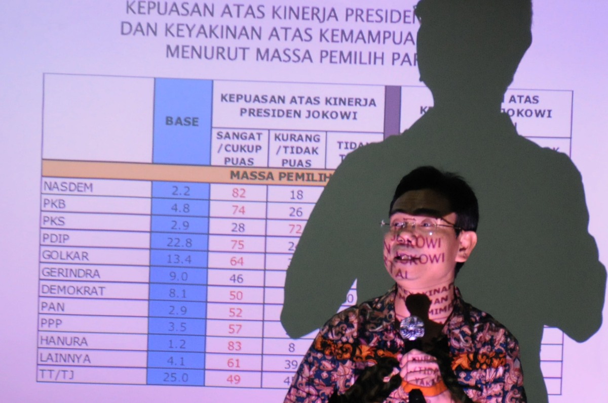 (Ilustrasi) Direktur Eksekutif Saiful Mujani Research and Consulting (SMRC) Djayadi Hanan memaparkan hasil survei lembaganya terkait kinerja Presiden Jokowi di Jakarta, Minggu (17/4/2016). Antara Foto/Teresia May.Joko Widodo
